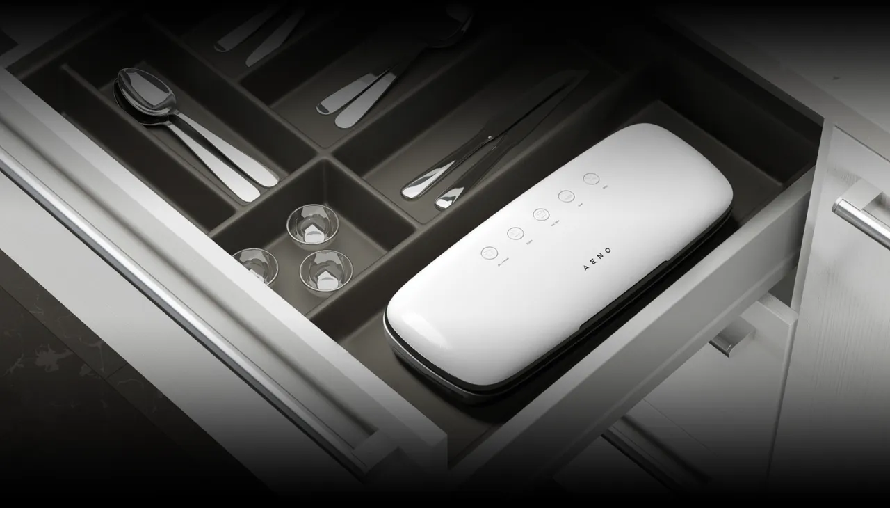 Με μήκος 38 cm και πάχος 7 cεκ., το σφραγιστικό κενού AENO δεν καταλαμβάνει πολύ χώρο και μπορεί να χωρέσει σε οποιοδήποτε ράφι