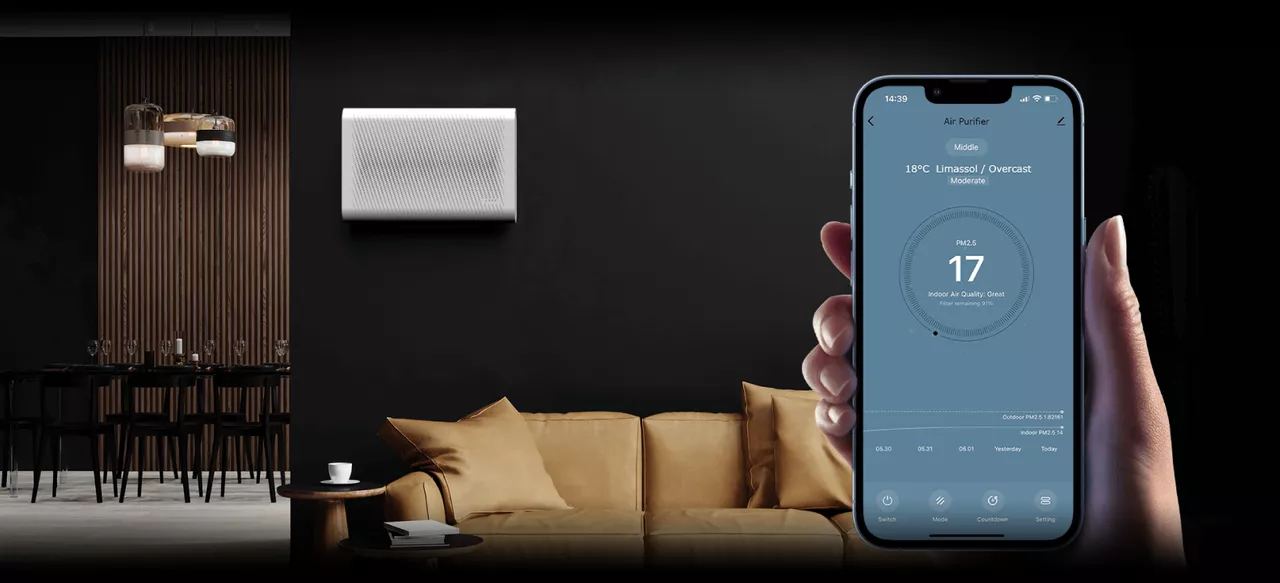 De luchtreiniger zit niet in de weg. Bevestig hem gewoon aan de muur met de bijgeleverde bevestigingen