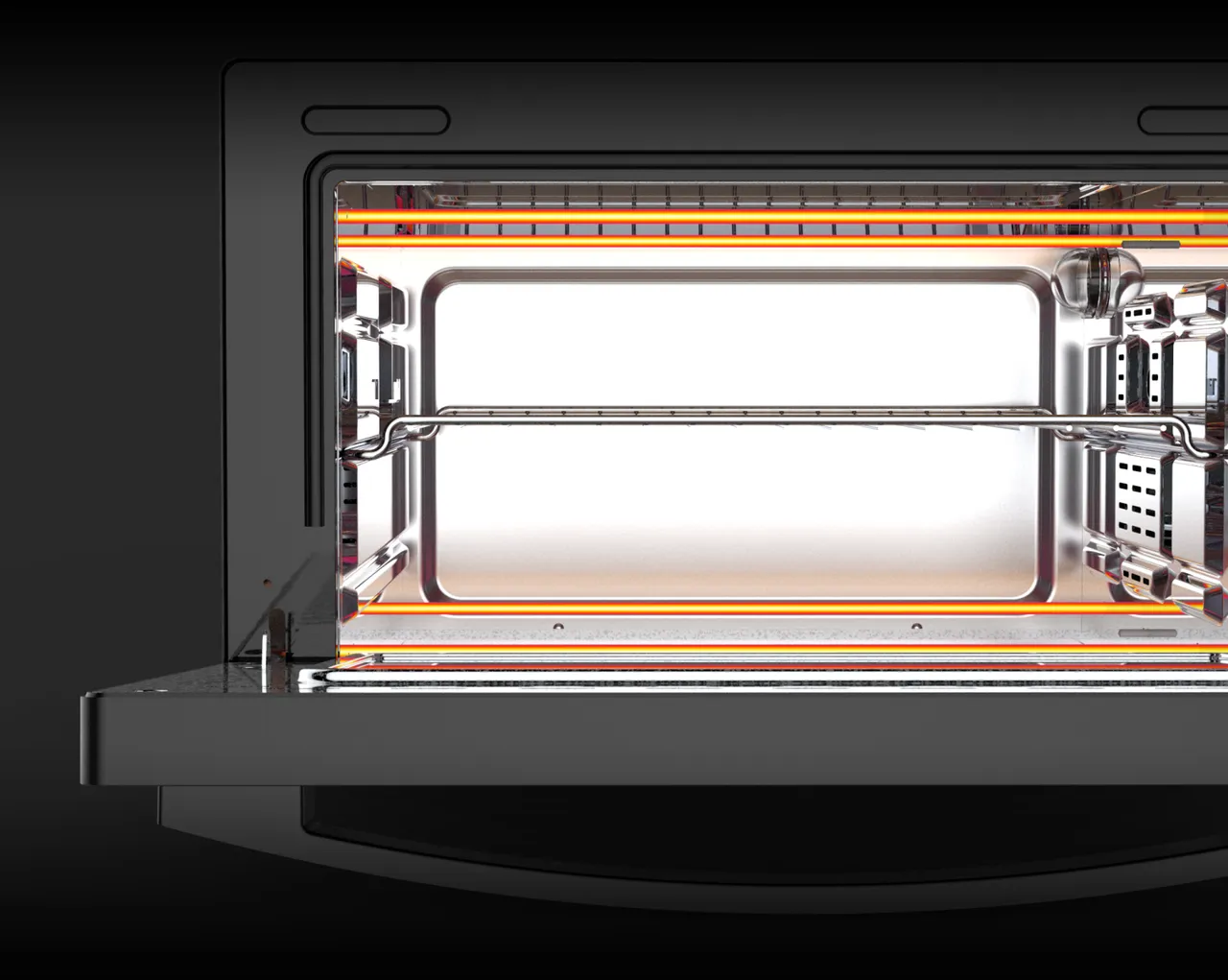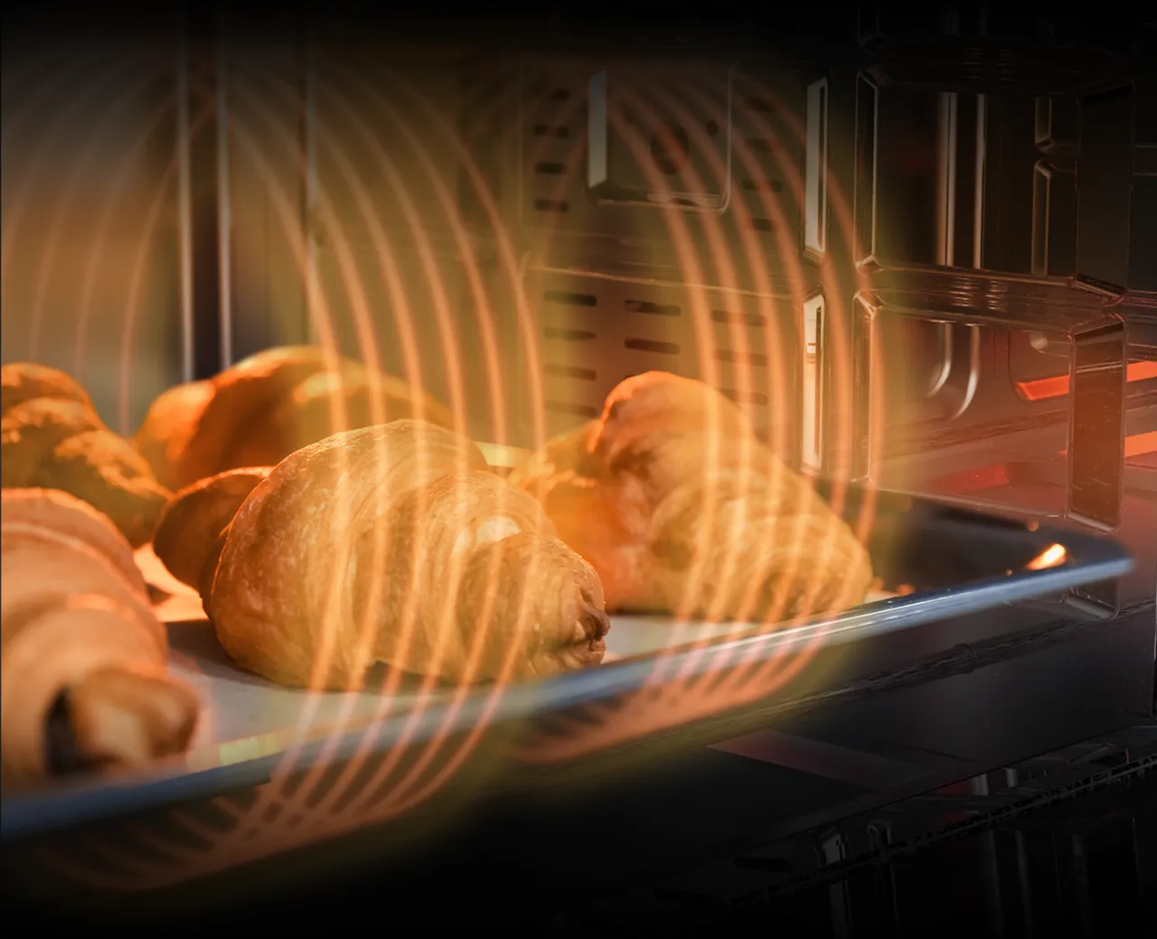 Two powerful heating elements on the top and two on the bottom quickly reach the desired temperature up to 230 °C and evenly bake the product on all sides